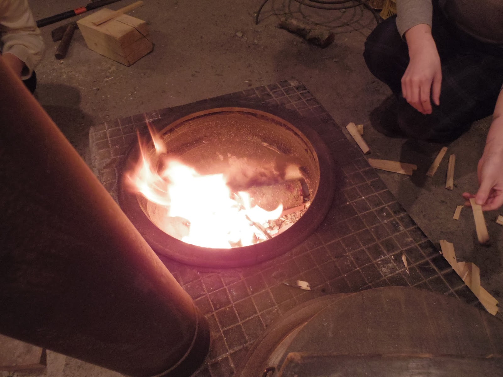 木材を斧で適当な大きさに割って、火をつけて、良い感じになったら太い枝に火がうつるようにします。